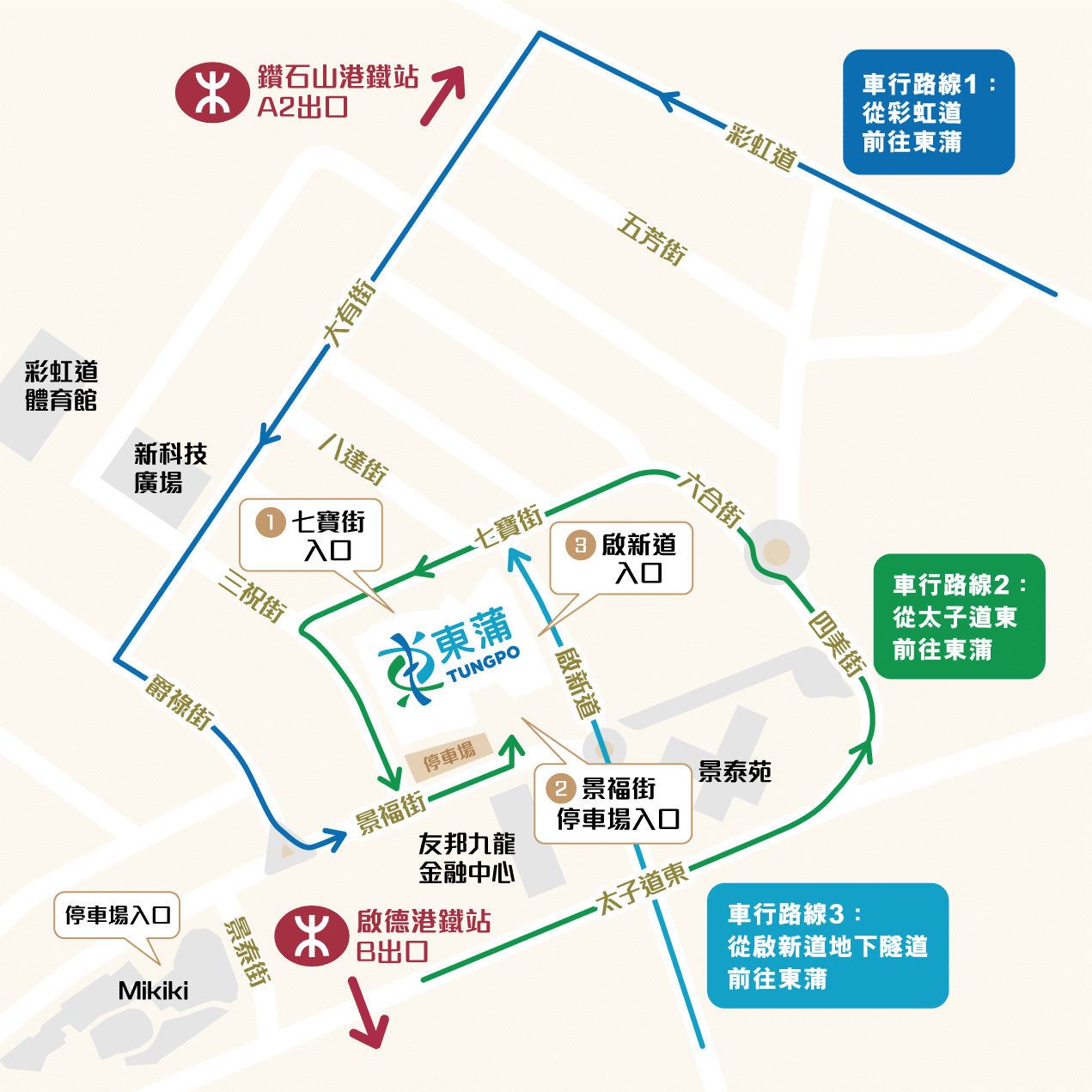 Drive along Prince Edward Road East (towards Kowloon City), keep to the left, and reach roundabout at Concorde Road / Olympic Avenue Traffic Circle. Turn left onto Concorde Road, then left to enter the Kai San Road traffic tunnel, turn left to Luk Hop Street, turn left onto Tsat Po Street, turn left onto Sam Chuk Street, turn left onto King Fuk Street, and then turn left into the TungPo Carpark.
